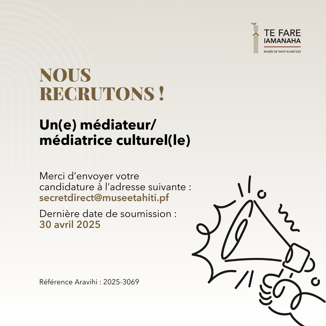 - Dépôt des candidatures à l’adresse suivante : secretdirect@museetahiti.pf