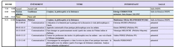 - 11h-12h : Intervention de Muriel PERRONNET : Muriel Perronnet a engagé des enseignants stagiaires dans l’apprentissage et la mise en œuvre de pratiques philosophiques à partir d’un corpus d’ouvrages de littérature de jeunesse océanienne. Sa communication rendra compte de cette appropriation pédagogique et des