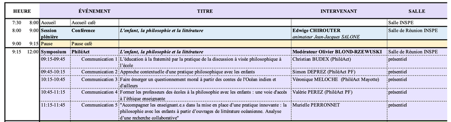 - 10h-11h : Intervention de Simon DEPREZ : Pourquoi et comment prendre en considération le contexte d’enseignement dans une pratique philosophique ? L’objet de la conférence sera d’exposer les travaux d’une thèse réalisée en Polynésie française dont la didactique contextualisée s’appuie sur trois leviers : la littérature endogène, l’implication parentale et le bilinguisme français-tahitien.