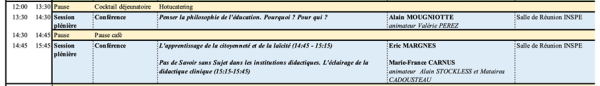- 14h30-15h30 : Conférence de Matthieu Gagnon : Matthieu Gagnon travaille depuis de nombreuses années au développement de la pensée critique des jeunes pratiquant le dialogue philosophique. La communication proposée sera l’occasion de dresser un bilan de ces années de recherche, et d’en présenter les principaux résultats.